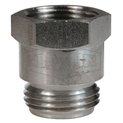 Dixon® Adapter, Connection Type 1: GHT, Gender 1: Male, Connection Size 1: 3/4 in, Thread Size 1: 3/4-11-1/2, Connection Type 2: NPT, Gender 2: Female, Connection Size 2: 3/4 in, Thread Size 2: 3/4-14, Hex Size: 1-3/16 in, Material Construction: 303 Stainless Steel, Dimensions: 1.37 in L, 34 - 195 deg F