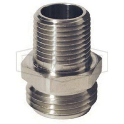 Dixon® Adapter, Connection Type 1: GHT, Gender 1: Male, Connection Size 1: 3/4 in, Thread Size 1: 3/4-11-1/2, Connection Type 2: NPTF, Gender 2: Male, Connection Size 2: 3/4 in, Thread Size 2: 3/4-14, Hex Size: 1-1/16 in, Material Construction: 303 Stainless Steel, Dimensions: 1-1/2 in L, 34 - 195 deg F