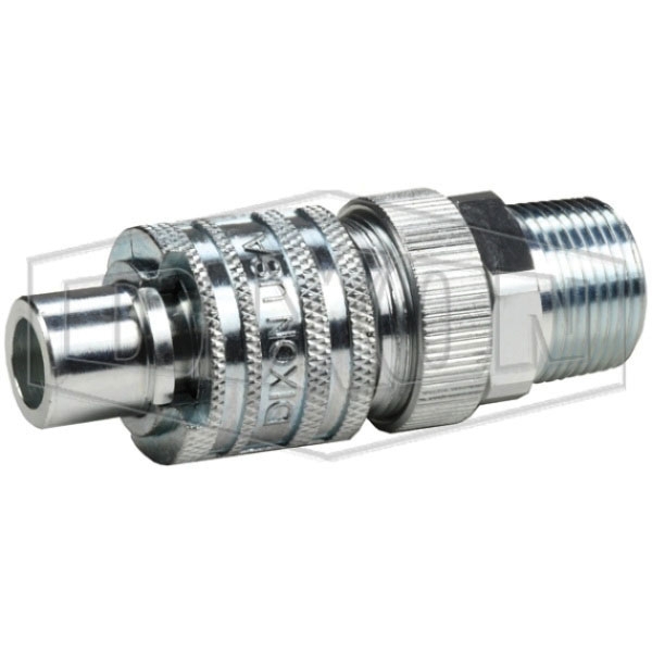 Dixon® Dix-Lock™ Interchange Safety-Lock End Plug, Series: N, Connection Type 1: Quick Disconnect, Gender 1: Male, Connection Size 1: 1/2 in, Connection Type 2: NPTF, Gender 2: Male, Connection Size 2: 3/4 in, Thread Size 2: 3/4-14, Hex Size: 1-3/16 in, 500 psi, Material Construction: Steel, Dimensions: 1.31 in OD x 3.65 in L, -40 to 250 deg F