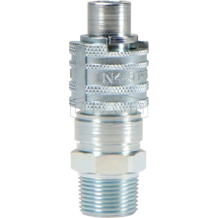 Dixon® Dix-Lock™ Interchange Plug, Series: N, Connection Type 1: Quick Disconnect, Gender 1: Male, Connection Size 1: 1/2 in, Connection Type 2: NPTF, Gender 2: Male, Connection Size 2: 1/2 in, Thread Size 2: 1/2-14, Hex Size: 1-3/16 in, 500 psi, Material Construction: Steel, Finish: Trivalent Chrome-Plated, Dimensions: 1.31 in Dia x 3.65 in L, -40 to 250 deg F