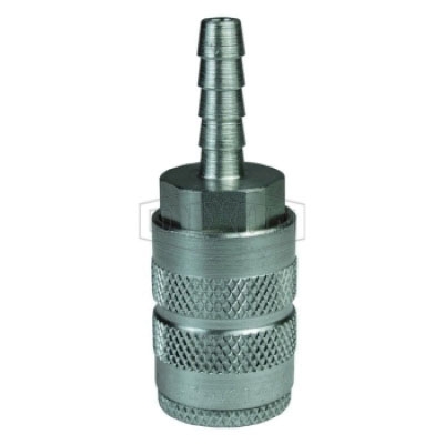Dixon® Pneumatic Manual Industrial Interchange Coupler, Series: F, Connection Type 1: Quick Disconnect, Connection Size 1: 1/4 in, Connection Type 2: Hose Barb, Connection Size 2: 3/8 in, Hex Size: 3/4 in, Material Construction: 303 Stainless Steel, Dimensions: 0.88 in OD x 2.53 in L, -40 to 250 deg F
