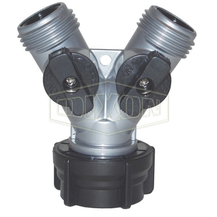 Dixon® Twin Shut-Off Y Valve, Connection Type 1: GHT, Gender 1: Male, Connection Size 1: 3/4 in, Connection Type 2: GHT, Gender 2: Male, Connection Size 2: 3/4 in, Connection Type 3: GHT, Gender 3: Female, Connection Size 3: 3/4 in, 60 psi, Material Construction: Zinc, Finish: Powder-Coated, Dimensions: 2-17/32 in L x 3-1/16 in W, 100 deg F