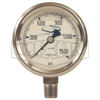 Dixon® Liquid Filled Pressure Gauge, Measuring System: psi, Pressure Range: 0 - 400 psi, Connection Size: 1/4 in, 2-1/2 in Dial Size, +/-2-1-2 % Accuracy, -4 to 140 deg F, Lower Back Mount, Stainless Steel Case, Lens Material: Polycarbonate