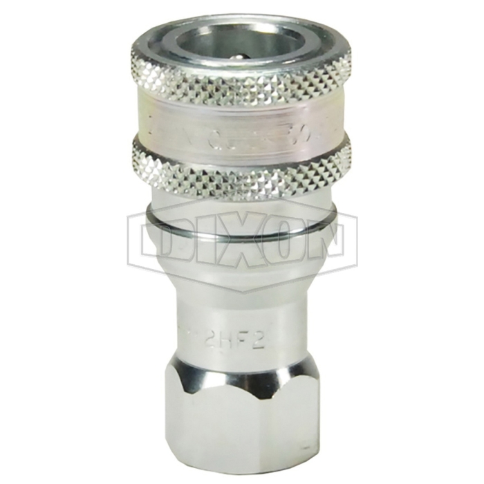 Dixon® ISO-B Poppet Interchange Valve Coupler, Series: H, Connection Type 1: Quick Disconnect, Connection Size 1: 3/4 in, Connection Type 2: ORB, Gender 2: Female, Connection Size 2: 3/4 in, Hex Size: 1-5/16 in, 4000 psi, Material Construction: Steel, Finish: Trivalent Chrome-Plated, Dimensions: 3.69 in L, Dimension Standards: ISO 7241 Series B, -40 to 250 deg F