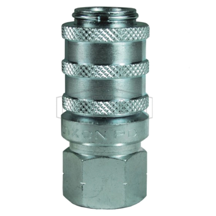 Dixon® Diagnostic Coupler, Series: PD, Connection Type 1: Quick Disconnect, Connection Size 1: 1/8 in, Connection Type 2: NPT, Gender 2: Female, Connection Size 2: 1/4 in, Thread Size 2: 1/4-18, Hex Size: 21 mm, 6000 psi, Material Construction: Steel, Finish: Trivalent Chrome-Plated, Dimensions: 2.13 in L, -40 to 250 deg F