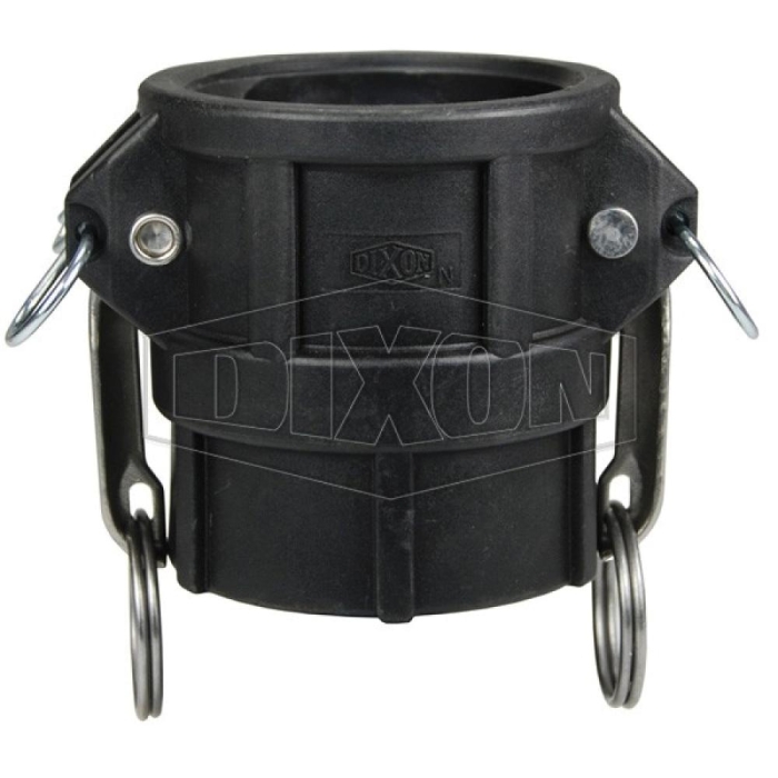 Dixon® Cam and Groove Coupler, Coupling Fitting, 3/4 in Connection Size 1, Connection Type 1: Type D, 1/2 in Connection Size 2, Connection Type 2: FNPT, Type D|FNPT Connection, Polypropylene, Material Construction: Polypropylene, 1-11/16 in Dia x 2-1/8 in L, 125 psi Maximum Operating Pressure, 70 deg F Operating Temperature