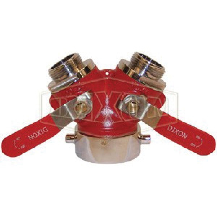 Dixon® Full-Flow Turn Ball-Type Wye Valve Fire Hose Fitting, Connection Type 1: NST/NH Swivel, Gender 1: Female, Connection Size 1: 1-1/2 in, Connection Type 2: NST/NH, Gender 2: Male, Connection Size 2: 1-1/2 in, 175 psi, Material Construction: Cast Brass, For Use With: Charged Pre-Connected Hose Lines
