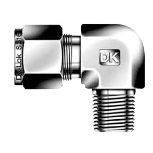 DK-LOK 90 deg Elbow, Series: DLM-N, Connection Type 1: Tube, Gender 1: 1/4 in, Connection Type 2: NPT, Gender 2: Male, Connection Size 2: 1/8 in, Hex Size: 9/16 in, Material Construction: 316/316L Stainless Steel