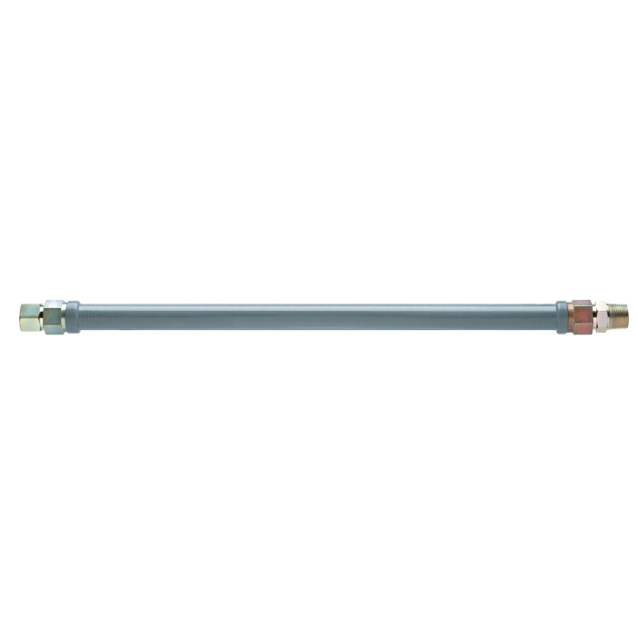 This 1-1/4 in OD, 1 in ID, durable, corrosion-resistant stainless steel gas connector is configured with 1 in MIP x 1 in MIP adapters and is 18 in in length. Provided with a hot-dipped, heavy-duty gray PVC coating, this gas connector is used for indoor and outdoor high BTU applications such as rooftop units and tankless water heaters. Designed with safety in mind, this is a CSA approved gas connector.
