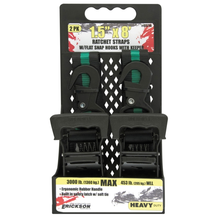 Erickson 05716 Green on Black Ratcheting Tie Down, 8 ft L, 1-1/2 in W, 3000 lb