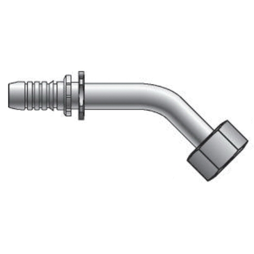 Gates® GlobalSpiral™ Crimp Hose 45 deg Elbow, Connection Type 1: Hose, Connection Size 1: 3/8 in, Hose Dash Size: 06, Connection Type 2: BSPP O-Ring Swivel, Gender 2: Female, Connection Size 2: 3/8 in, Nominal Size: 3/8 in, Thread Size 2: 3/8-19, Hex Size: 22 mm, 6000 psi, Cut-Off Factor: 1.86 in, Material Construction: Steel, Finish: TuffCoat®, Dimension Standards: ISO Working Draft 12151-6, 250 deg F