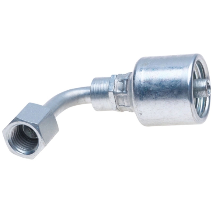 Gates® MegaCrimp® Crimp Hose 90 deg Elbow, Connection Type 1: Hose, Connection Size 1: 3/4 in, Hose Dash Size: 12, Connection Type 2: SAE 45 deg Flare Swivel, Gender 2: Female, Connection Size 2: 3/4 in, Nominal Size: 3/4 in, Thread Size 2: 1-1/16-14, Hex Size: 1-1/4 in, Cut-Off Factor: 1.93 in, Finish: TuffCoat®