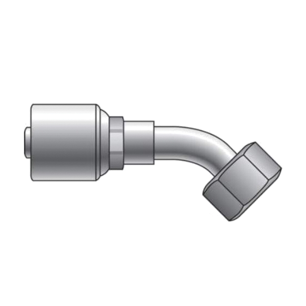Gates® MegaCrimp® Crimp Hose 45 deg Elbow, Connection Type 1: Hose, Connection Size 1: 1-1/4 in, Hose Dash Size: 20, Connection Type 2: ORFS Swivel, Gender 2: Female, Connection Size 2: 1-1/4 in, Nominal Size: 1-1/4 in, Thread Size 2: 1-11/16-12, Hex Size: 50 mm, Cut-Off Factor: 3.9 in, Finish: TuffCoat®, Dimension Standards: SAE J1453