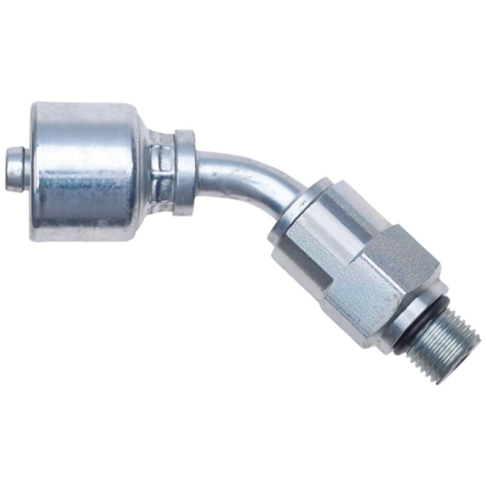 Gates® MegaCrimp® Crimp Hose 45 deg Elbow, Connection Type 1: Hose, Connection Size 1: 3/8 in, Hose Dash Size: 06, Connection Type 2: SAE ORB Swivel, Gender 2: Male, Connection Size 2: 3/8 in, Nominal Size: 3/8 in, Thread Size 2: 9/16-18, Hex Size: 22 mm, Cut-Off Factor: 2.54 in, Finish: TuffCoat®, Dimension Standards: SAE J1926/3, ISO 11926-3