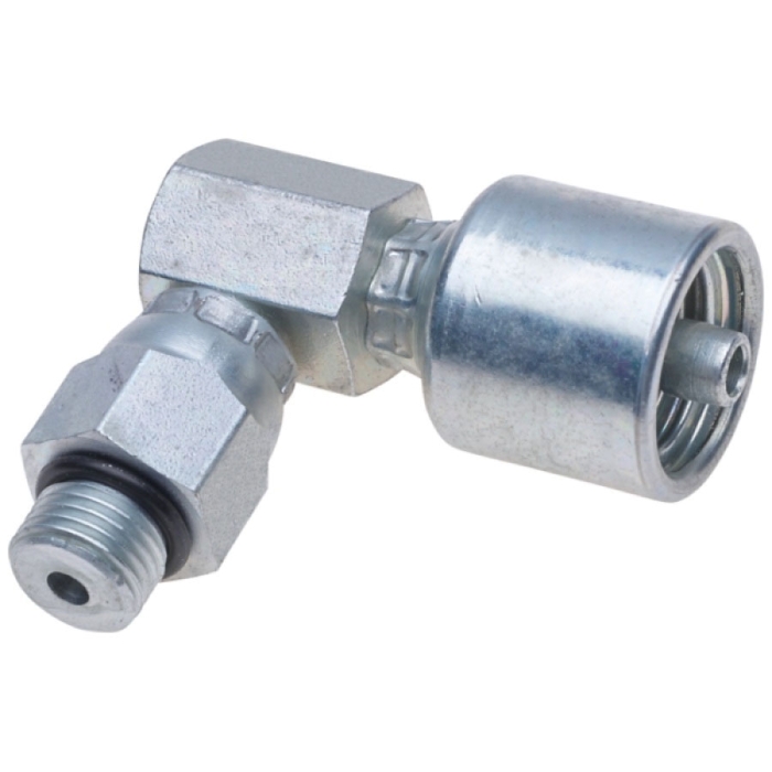 Gates® MegaCrimp® Crimp Hose 90 deg Elbow Block, Connection Type 1: Hose, Connection Size 1: 1/2 in, Hose Dash Size: 08, Connection Type 2: SAE ORB Swivel, Gender 2: Male, Connection Size 2: 3/4 in, Nominal Size: 3/4 in, Thread Size 2: 1-1/16-12, Hex Size: 1-5/16 in, Cut-Off Factor: 1.07 in, Finish: TuffCoat®, Dimension Standards: SAE J1926/3, ISO 11926-3