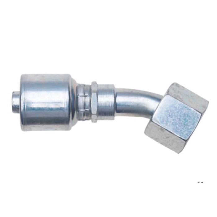 Gates® MegaCrimp® Crimp Hose 45 deg Elbow, Connection Type 1: Hose, Connection Size 1: 3/8 in, Hose Dash Size: 06, Connection Type 2: BSPP O-Ring Swivel, Gender 2: Female, Connection Size 2: 3/8 in, Nominal Size: 3/8 in, Thread Size 2: 3/8-19, Hex Size: 22 mm, Cut-Off Factor: 1.54 in, Finish: TuffCoat®