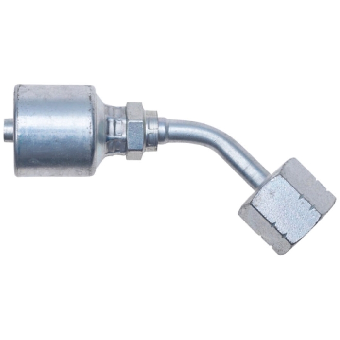 Gates® MegaCrimp® Crimp Hose 45 deg Elbow, Connection Type 1: Hose, Connection Size 1: 1/2 in, Hose Dash Size: 08, Connection Type 2: Komatsu Swivel, Gender 2: Female, Connection Size 2: 22 mm, Nominal Size: 22 mm, Thread Size 2: M22 x 1.5, Hex Size: 27 mm, Cut-Off Factor: 2.37 in, Finish: TuffCoat®