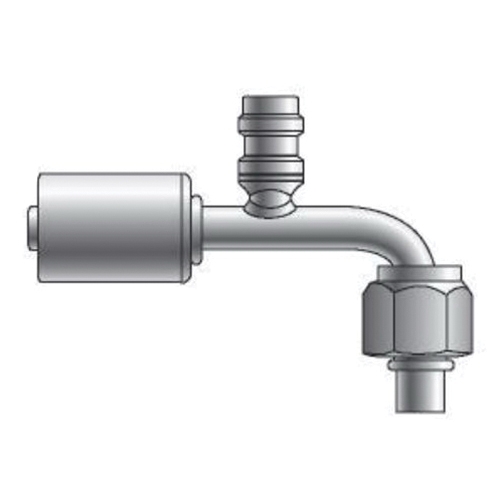 Gates® Polarseal® 90 deg Elbow with R134a Service Port, Connection Type 1: Hose, Connection Size 1: 5/16 in, Hose Dash Size: 05, Connection Type 2: SAE Tube O-Ring Nut Swivel, Gender 2: Female, Connection Size 2: 3/8 in, Thread Size 2: 5/8-18, Material Construction: Aluminum