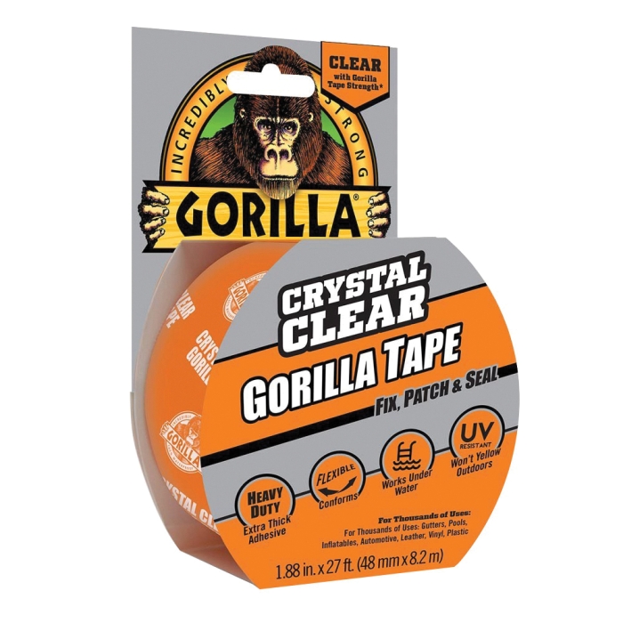 Crystal clear Gorilla® tape features the adhesive strength of Gorilla® tape, in a crystal clear tape that does not yellow outdoors. Made with a heavy-duty adhesive layer and waterproof backing for extreme durability. This tape is UV and temperature-resistant - great for projects and repairs both indoors and out. Crystal clear Gorilla® tape can be applied to wet surfaces and also works under water.