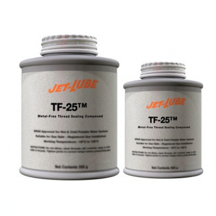 Contains, in part, reprocessed PTFE and graphite in a high-melting, high-temperature grease vehicle. It is further fortified with rust, corrosion and oxidation inhibitors. TF-25's lubricating and sealing properties will prevent thread leaks of fluids, gases, or steam. It can be used for a multitude of low friction, anti-seize applications requiring maximum performance. It protects all threads from premature wear and prolongs the life of tapered-thread joints under all conditions. Ideal for press fittings.