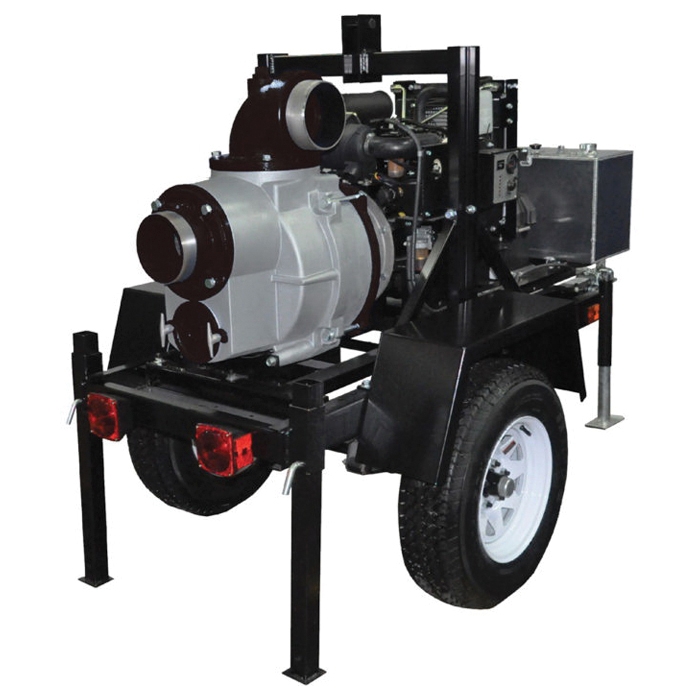 Koshin® Trash Pump, Series: KTH, 1000 gpm, Inlet Size: 6 in, Outlet Size: 6 in, Maximum Head: 98 ft, 180 deg F, Horsepower: 23 hp, Impeller Material: Stainless Steel, 3 in Maximum Diameter of Solids, Trailer Mount, Engine Specifications: Model Honda GX670, 688 cc, Fuel Tank Capacity: 20 gal, Fuel Type: Gasoline, 40 psi, Suction Lift: 26 ft