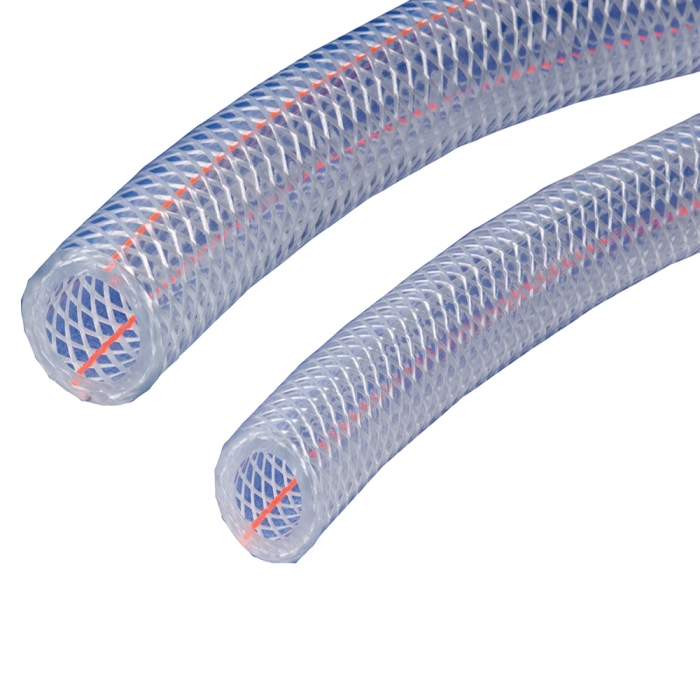 Kuriyama Kuri Tec® Commercial Grade Braided Reinforced Hose, Series: CLEARBRAID® C8580, Nominal Size: 1/2 in, 3/4 in OD, 1/2 in ID, 1 ft Length, 200 psi, Material Construction: PVC, Construction: Spiraled Polyester Yarn and Longitudinal Orange Tracer Yarns, Crystal Clear, Resistance Properties: Chemical, 25 deg F Low, 150 deg F High