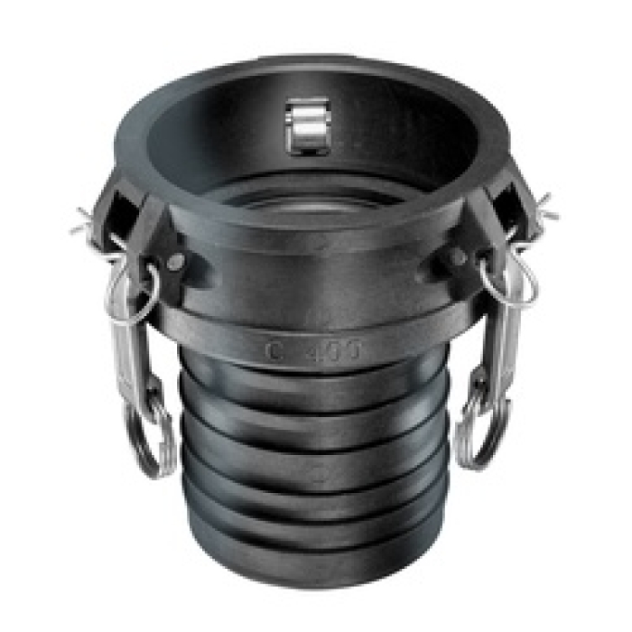Kuriyama Quick-Acting Coupling, Coupling Fitting, 1-1/2 in Connection Size 1, Connection Type 1: Female Coupler, 1-1/2 in Connection Size 2, Connection Type 2: Hose Shank, Female Coupler|Hose Shank Connection, Polypropylene, Material Construction: Polypropylene, Black, 100 psi Maximum Operating Pressure, 70 deg F Operating Temperature, Additional Information: 304 Stainless Steel Handle