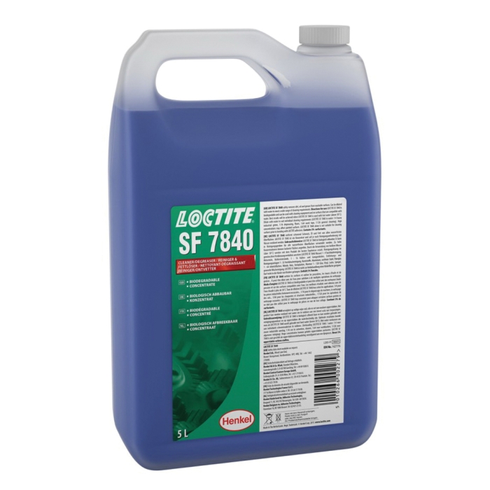 Loctite® SF 7840™ is a general-purpose, biodegradable parts cleaner and degreaser which can be diluted with water. Loctite® SF 7840™ is a concentrated, biodegradable cleaner that contains no hazardous solvents and dilutes with water to serve a wide range of industrial cleaning applications. Typical applications for this product include engines, motors, castings, valves, bearings, tanks, machinery, windows, carpets and concrete floors. The product can remove grease, lubricants, cutting oils, fuel oils, tar, road salt, light carbon, food stains, wax, animal fat, mildew and soot.