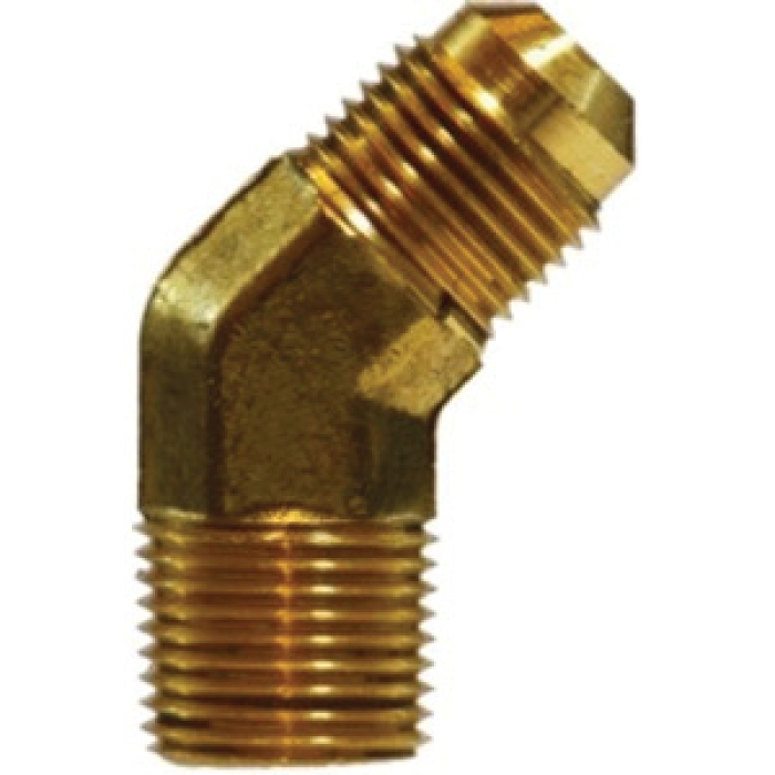MIDLAND INDUSTRIES 45 deg Elbow, Connection Type 1: SAE 45 deg Flare, Gender 1: Male, Connection Size 1: 3/4 in, Connection Type 2: NPTF, Gender 2: Male, Connection Size 2: 3/4 in, Material Construction: Brass, For Use With: Copper, Brass, Aluminum, and Steel Hydraulic Tubing that can be Flared, Dimension Standards: SAE 010302, -65 to 250 deg F