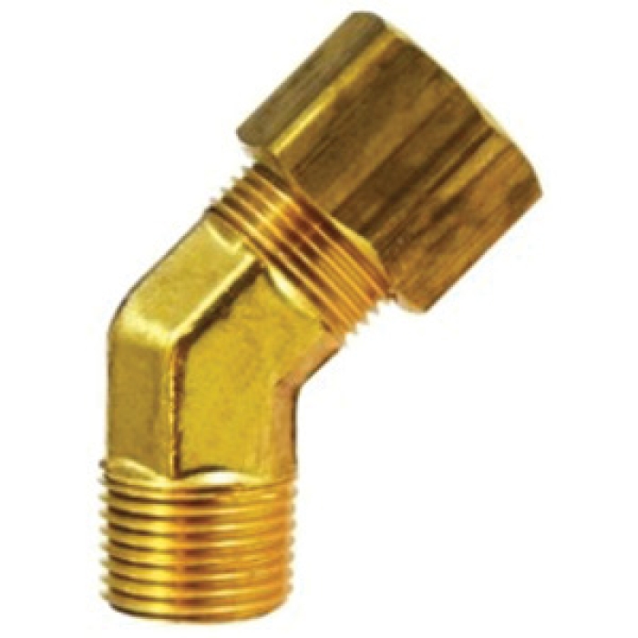MIDLAND INDUSTRIES 45 deg Elbow, Connection Type 1: Compression, Connection Size 1: 1/2 in, Connection Type 2: NPTF, Gender 2: Male, Connection Size 2: 1/2 in, 200 psi, Material Construction: Brass, For Use With: Aluminum, Copper, Brass, and Plastic Tubing, 73 deg F
