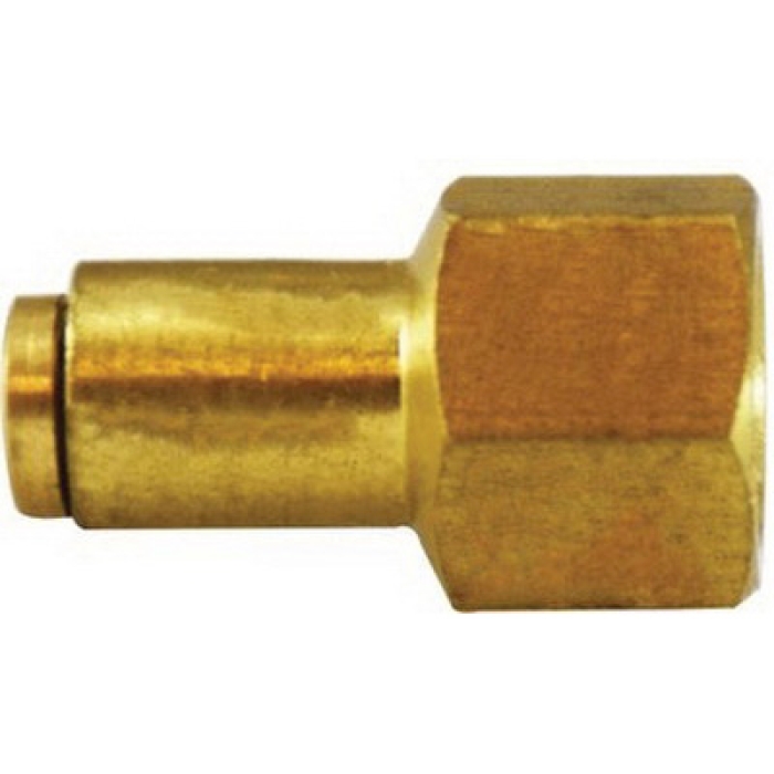 MIDLAND INDUSTRIES Straight Connector, Connection Type 1: Push-to-Connect, Connection Size 1: 1/8 in, Connection Type 2: NPTF, Gender 2: Female, Connection Size 2: 1/8 in, Hex Size: 0.56 in, Material Construction: Brass, Dimensions: 0.96 in L, -10 to 200 deg F