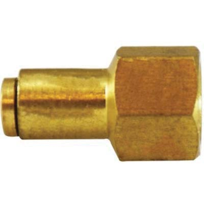 MIDLAND INDUSTRIES Straight Connector, Connection Type 1: Push-to-Connect, Connection Size 1: 1/4 in, Connection Type 2: NPTF, Gender 2: Female, Connection Size 2: 1/4 in, Hex Size: 3/4 in, Material Construction: Brass, Dimensions: 1.42 in L, -10 to 200 deg F