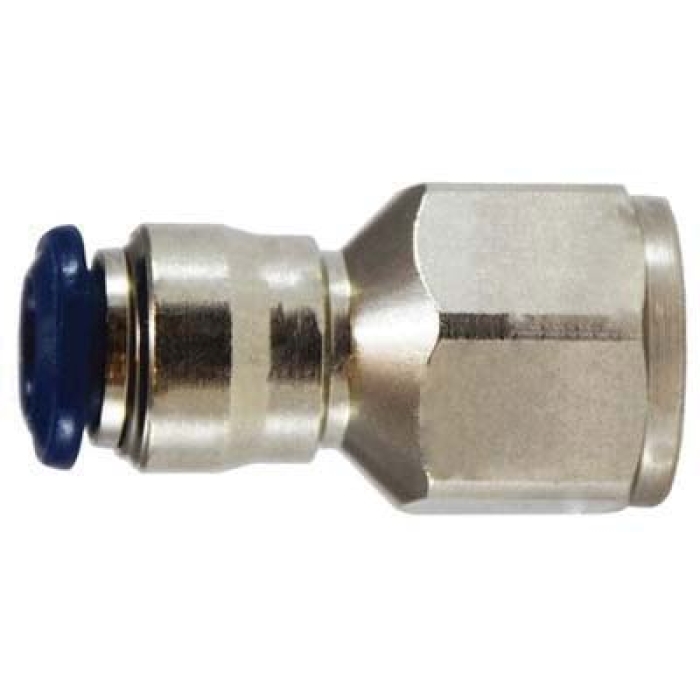 MIDLAND INDUSTRIES Straight Connector, Connection Type 1: Push-to-Connect, Connection Size 1: 1/8 in, Connection Type 2: NPTF, Gender 2: Female, Connection Size 2: 1/4 in, Hex Size: 0.63 in, 290 psi, Material Construction: Brass, Finish: Nickel-Plated, Dimensions: 1.14 in L, -4 to 176 deg F, For Use With: Nylon, Polyethylene, and Polyurethane Tubing