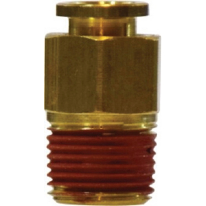 MIDLAND INDUSTRIES Straight Connector, Connection Type 1: Push-to-Connect, Connection Size 1: 1/4 in, Connection Type 2: NPTF, Gender 2: Male, Connection Size 2: 3/8 in, Hex Size: 0.68 in, 290 psi, Material Construction: Brass, -10 to 200 deg F