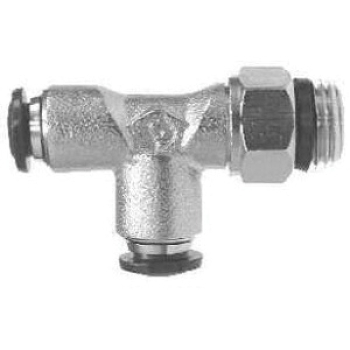 MIDLAND INDUSTRIES Run Tee, Connection Type 1: Push-to-Connect, Connection Size 1: 1/8 in, Connection Type 2: Push-to-Connect, Connection Size 2: 1/8 in, Connection Type 3: NPT Swivel, Gender 3: Male, Connection Size 3: 1/8 in, Hex Size: 0.51 in, 290 psi, Material Construction: Brass, Finish: Nickel-Plated, Dimensions: 1.48 in L, -4 to 176 deg F, For Use With: Nylon, Polyethylene, and Polyurethane Tubing