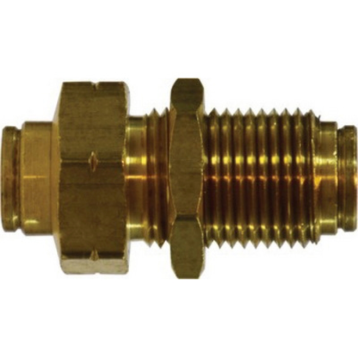 MIDLAND INDUSTRIES Bulkhead Union, Connection Type 1: Push-to-Connect, Connection Size 1: 1/4 in, Connection Type 2: Push-to-Connect, Connection Size 2: 1/4 in, Hex Size: 0.68 in, Material Construction: Brass, Dimensions: 1.69 in L, -10 to 200 deg F