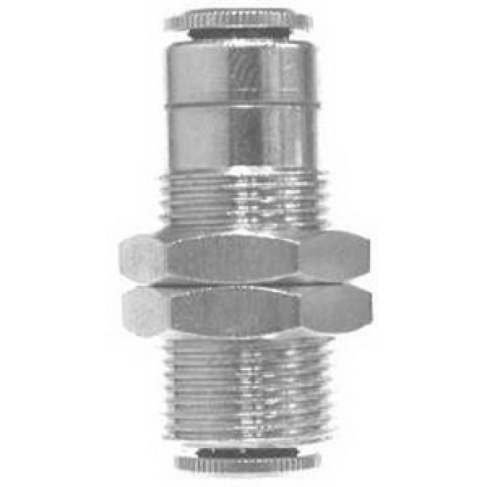 MIDLAND INDUSTRIES Bulkhead Union, Connection Type 1: Push-to-Connect, Connection Size 1: 1/4 in, Connection Type 2: Push-to-Connect, Connection Size 2: 1/4 in, Hex Size: 0.67 in, 290 psi, Material Construction: Brass, Finish: Nickel-Plated, Dimensions: 1.38 in L, -4 to 176 deg F, For Use With: Nylon, Polyethylene, and Polyurethane Tubing