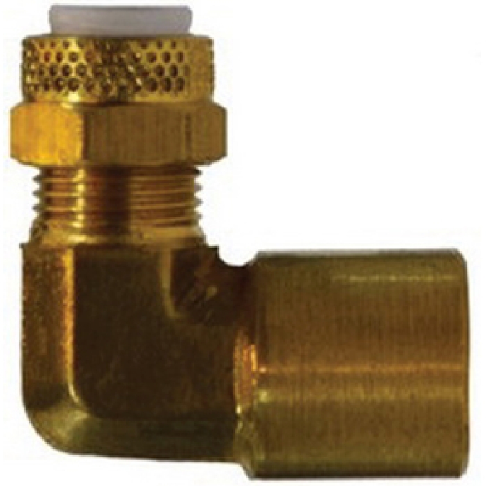 MIDLAND INDUSTRIES Flareless 90 deg Elbow, Connection Type 1: Tube, Connection Size 1: 3/16 in, Thread Size 1: 3/8-24, Connection Type 2: NPTF, Gender 2: Female, Connection Size 2: 1/8 in, Material Construction: Brass, -65 to 250 deg F, For Use With: Aluminum and Copper Tubing