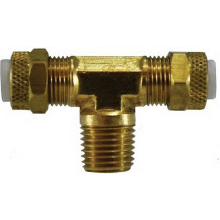 MIDLAND INDUSTRIES Flareless Branch Tee, Connection Type 1: Tube, Connection Size 1: 1/4 in, Thread Size 1: 3/8-24, Connection Type 2: Tube, Connection Size 2: 1/4 in, Thread Size 2: 3/8-24, Connection Type 3: NPTF, Gender 3: Male, Connection Size 3: 1/8 in, Thread Size 3: 5/16-24, Material Construction: Brass, -40 to 150 deg F, For Use With: Aluminum and Copper Tubing