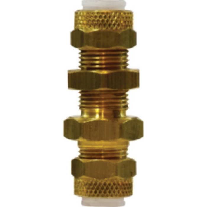 MIDLAND INDUSTRIES Flareless Bulkhead Union, Connection Type 1: Tube, Connection Size 1: 5/16 in, Thread Size 1: 7/16-24, Connection Type 2: Tube, Connection Size 2: 5/16 in, Thread Size 2: 7/16-24, Hex Size: 0.62 in, Material Construction: Brass, For Use With: Aluminum and Copper Tubing