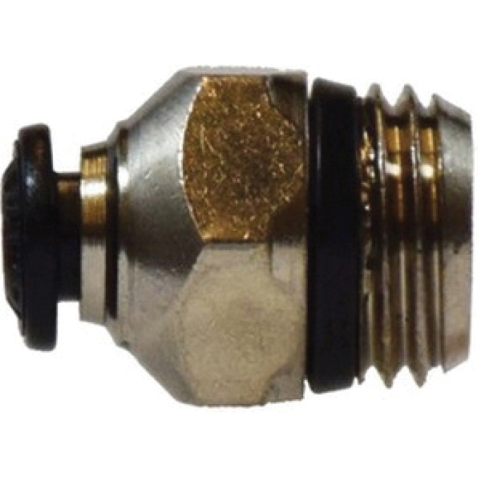MIDLAND INDUSTRIES Straight Connector, Connection Type 1: Metric Push-to-Connect, Connection Size 1: 6 mm, Connection Type 2: NPT, Gender 2: Male, Connection Size 2: 1/4 in, Hex Size: 0.546 in, 290 psi, Material Construction: Brass, Finish: Nickel-Plated, Dimensions: 0.819 in L, -4 to 176 deg F, For Use With: Nylon, Polyethylene, and Polyurethane Tubing