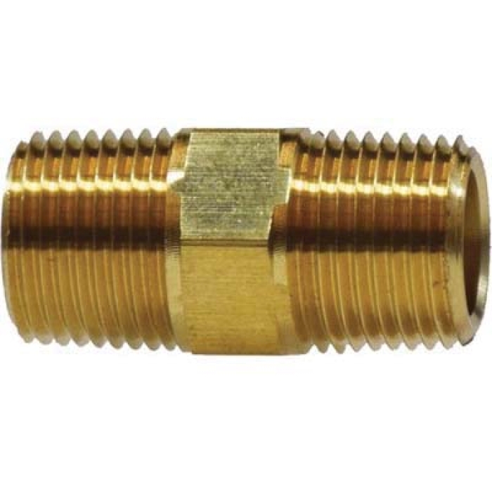 MIDLAND INDUSTRIES Hex Nipple, Connection Type 1: NPT, Gender 1: Male, Connection Size 1: 1 in, Connection Type 2: NPT, Gender 2: Male, Connection Size 2: 1 in, Hex Size: 1.39 in, 1200 psi, Material Construction: Brass, For Use With: Brass, Bronze, Copper, Steel, Aluminum, and Iron Pipe, 1-3/4 in Length, Dimension Standards: SAE 122, 130137, -65 to 250 deg F