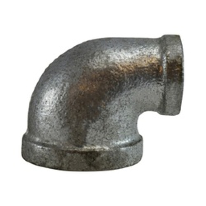 MIDLAND INDUSTRIES 90 deg Reducing Elbow, 90 deg Elbow Fitting, 1 in Connection Size 1, Connection Type 1: FPT, 3/4 in Connection Size 2, Connection Type 2: FPT, FPT|FPT Connection, Iron, Material Construction: Malleable Iron, Finish: Galvanized, 1-11-1/2 x 3/4-14 Thread, Pressure Class: 150 lb, Dimension Standards: ANSI B16.3, -20 to 350 deg F, Additional Information: 1.37 x 1.45 in Center to End