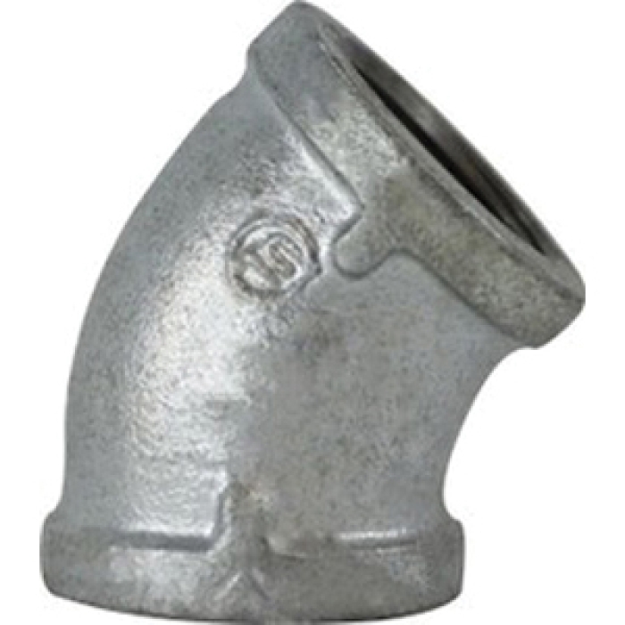 MIDLAND INDUSTRIES 45 deg Pipe Elbow, Connection Type 1: NPT, Connection Size 1: 1 in, Connection Type 2: NPT, Connection Size 2: 1 in, 150 lb, Material Construction: Malleable Iron, Finish: Galvanized, Dimension Standards: ANSI B16.3, ANSI B2.1 or BS 21, -20 to 350 deg F