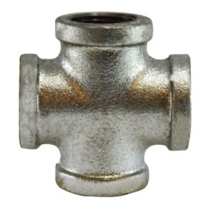 MIDLAND INDUSTRIES Cross, Cross Fitting, 1-1/2 in Connection Size 1, Connection Type 1: FPT, 1-1/2 in Connection Size 2, Connection Type 2: FPT, Connection Size 3: 1-1/2 in, Connection Type 3: FPT, Connection Size 4: 1-1/2 in, Connection Type 4: FPT, FPT|FPT|FPT|FPT Connection, Iron, Material Construction: Malleable Iron, Finish: Galvanized, 1-1/2-11-1/2 Thread, 150 psi, Dimension Standards: ANSI B16.3, 3.88 in L, -20 to 350 deg F, Additional Information: 1.94 in Center to End, 1.91 lb Weight