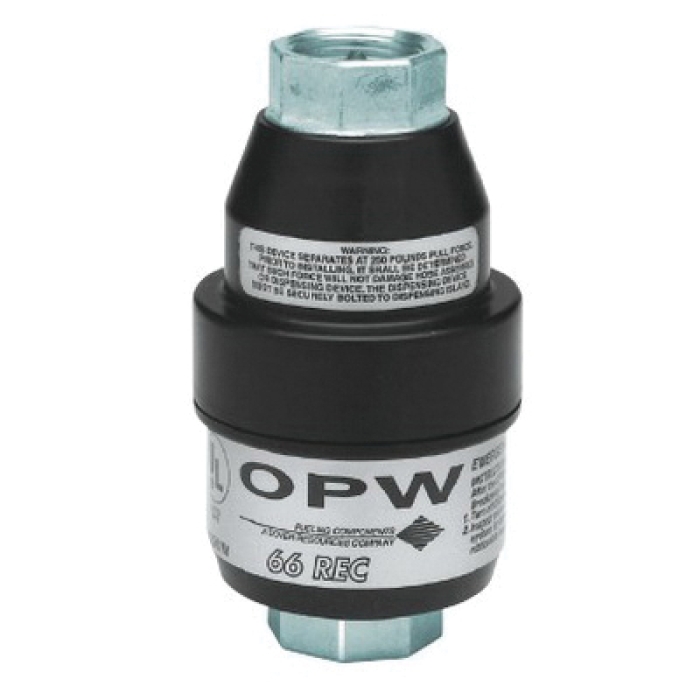 The OPW® 66REC is the first dry reconnectable breakaway for the conventional dispensing market. It is designed to be installed on fuel dispensing hoses and will separate when subjected to a designated pull force. The dual valves seat automatically, stopping the flow of fuel and limiting any fuel spillage, while protecting the dispensing equipment. When reconnecting the separated halves, the 66REC seals tightly on an O-ring before the poppet stems engage to open the valve. For proper operation on high-hanging hoses, the OPW® 66REC 3/4 in must always be installed with a "straightening" hose with a minimum length of 9 in, such as the OPW® 66H. For low hose applications, the OPW® 66REC should be installed downstream of the retractor cable.