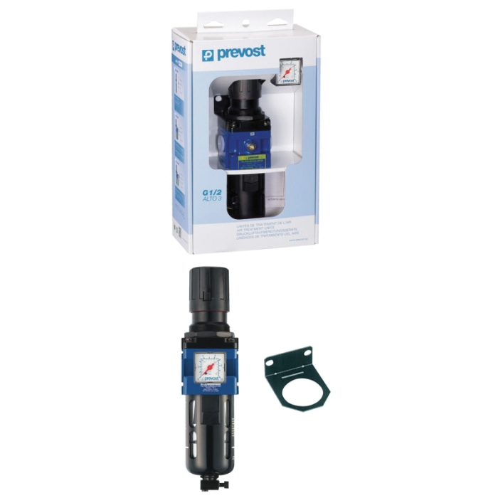 Prevost® Manual Drain Filter/Regulator Combo, Series: KTM, Inlet Pipe Size: 1/2 in, Outlet Pipe Size: 1/2 in, Inlet Thread Type: FPT, Outlet Thread Type: FPT, 105.96 cfm, Pressure Regulating Range: 0 - 145 psi, 174 psi, Remove Down Particle Size: 25 um, Material Construction: Aluminum, Dimensions: 2-3/4 in W x 11 in H, Includes: Wall Bracket and Gauge
