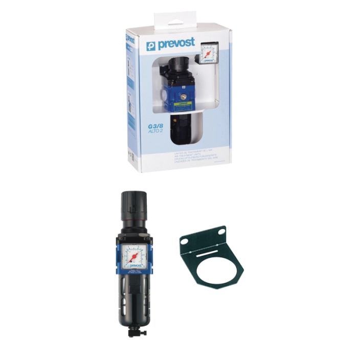 Prevost® Manual Drain Filter/Regulator Combo, Series: KTM, Inlet Pipe Size: 3/8 in, Outlet Pipe Size: 3/8 in, Inlet Thread Type: FPT, Outlet Thread Type: FPT, 63.54 cfm, Pressure Regulating Range: 0 - 145 psi, 174 psi, Remove Down Particle Size: 25 um, Material Construction: Aluminum, Includes: Wall Bracket and Gauge