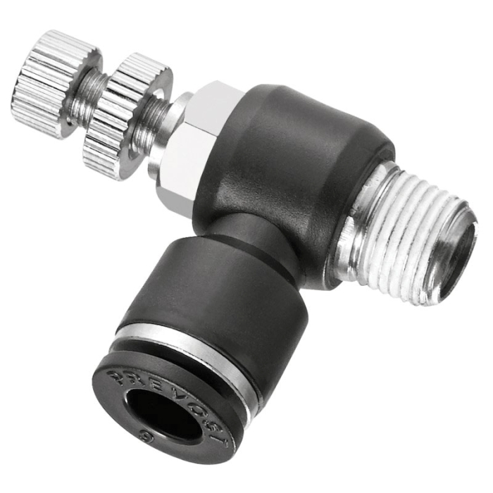 Prevost® Bi-Directional 90 deg Flow Regulator with Knob, Series: RPM BR, Connection Type 1: Push-to-Connect, Connection Size 1: 1/4 in, Connection Type 2: NPT, Gender 2: Male, Connection Size 2: 1/4 in, 0 - 145 psi, Material Construction: Brass/Polymer, Finish: Nickel-Plated, Dimensions: 1.004 in L, 32 - 140 deg F, For Use With: 1/4 in OD Tubing