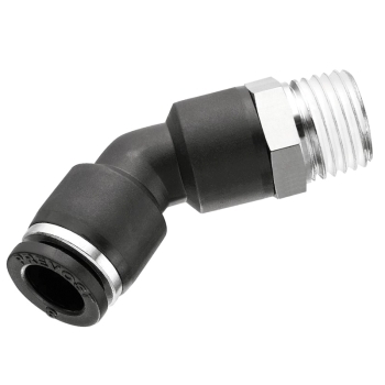 Prevost® 45 deg Swivel Elbow, Series: RPQ MR, Connection Type 1: Push-to-Connect, Connection Size 1: 3/8 in, Connection Type 2: NPT, Gender 2: Male, Connection Size 2: 3/8 in, 0 - 145 psi, Material Construction: Brass/Polymer, Finish: Nickel-Plated, Dimensions: 1.319 in L, 32 - 140 deg F, For Use With: 3/8 in OD Tubing